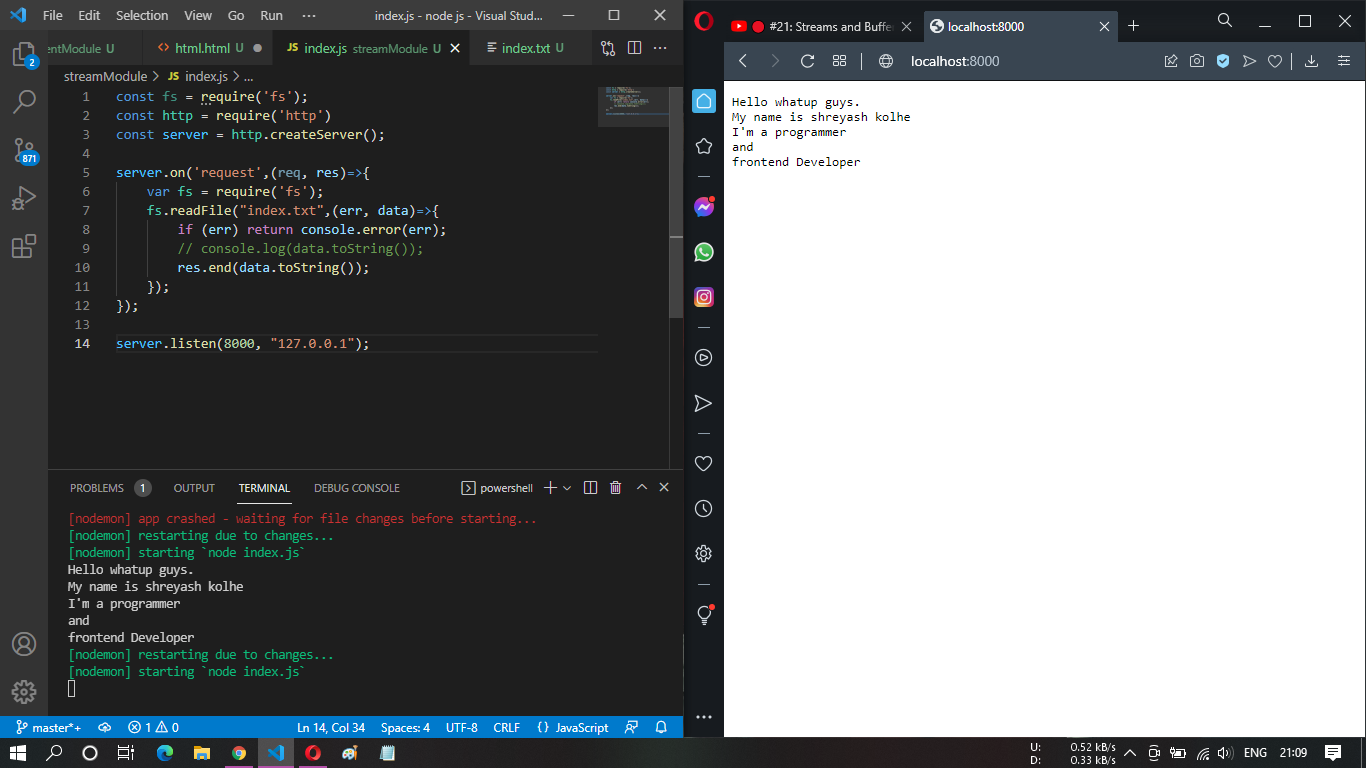 Outputconst fs = require('fs');const http = require('http')const server = http.createServer();server.on('request',(req, res)=>{const rstream = fs.createReadStream('index.txt');rstream.on('data',(chunkData)=>{res.write(chunkData);})rstream.on('end',()=>{res.end();});rstream.on('error',(err)=>{console.log(err);})});server.listen(8000, "127.0.0.1");
